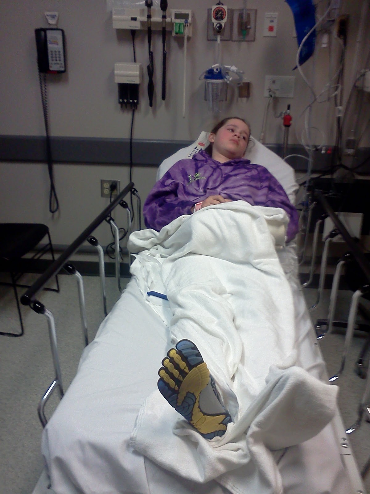 Four hours laters, the break was set, the splint was on, the sling was in place, and the pain pills had kicked in. Even better? She was still rocking her Vibram Five Fingers...those shoes made her the star of the ER.